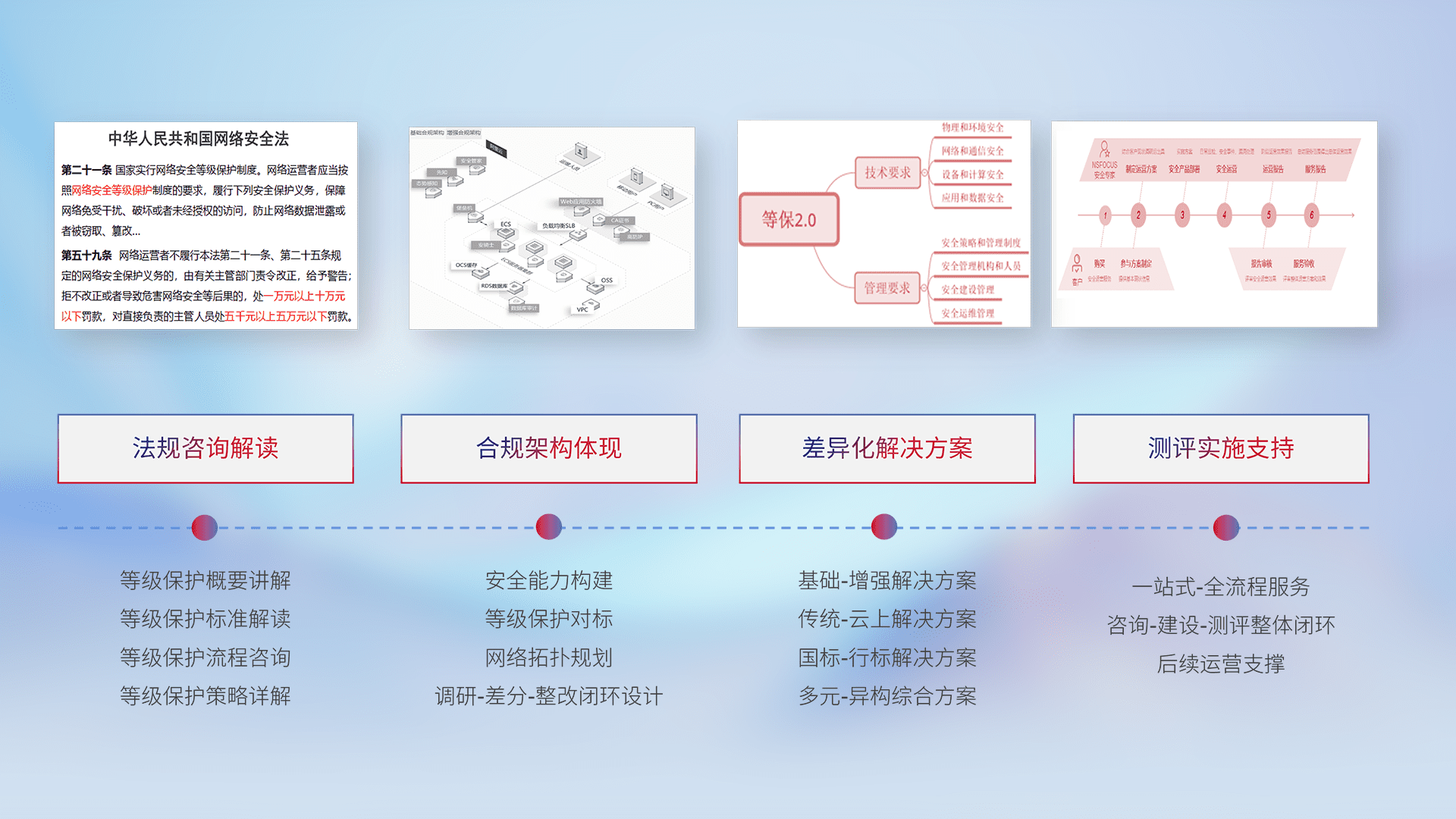 通过专业的法律咨询解读、、合规架构体现、、、、差异化解决方案、、测试实施支持等服务,,为客户量身打造等保合规体系。。